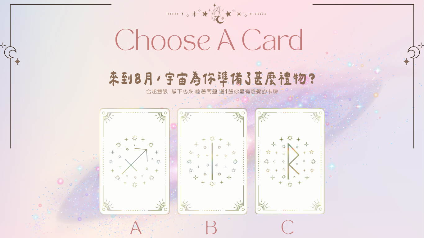 踏入下半年,在這個8月,不妨抽一張塔羅牌為你揭曉,宇宙為你準備了甚麼「禮物」。可能是一份洞察、一段提醒、一顆種子,或是一份讓你更靠近真我的契機。閉上眼,對自己說:「我準備好接收宇宙的恩典。」然後,從以下三張牌中,憑直覺選出一張。你的8月禮物,就藏在其中。