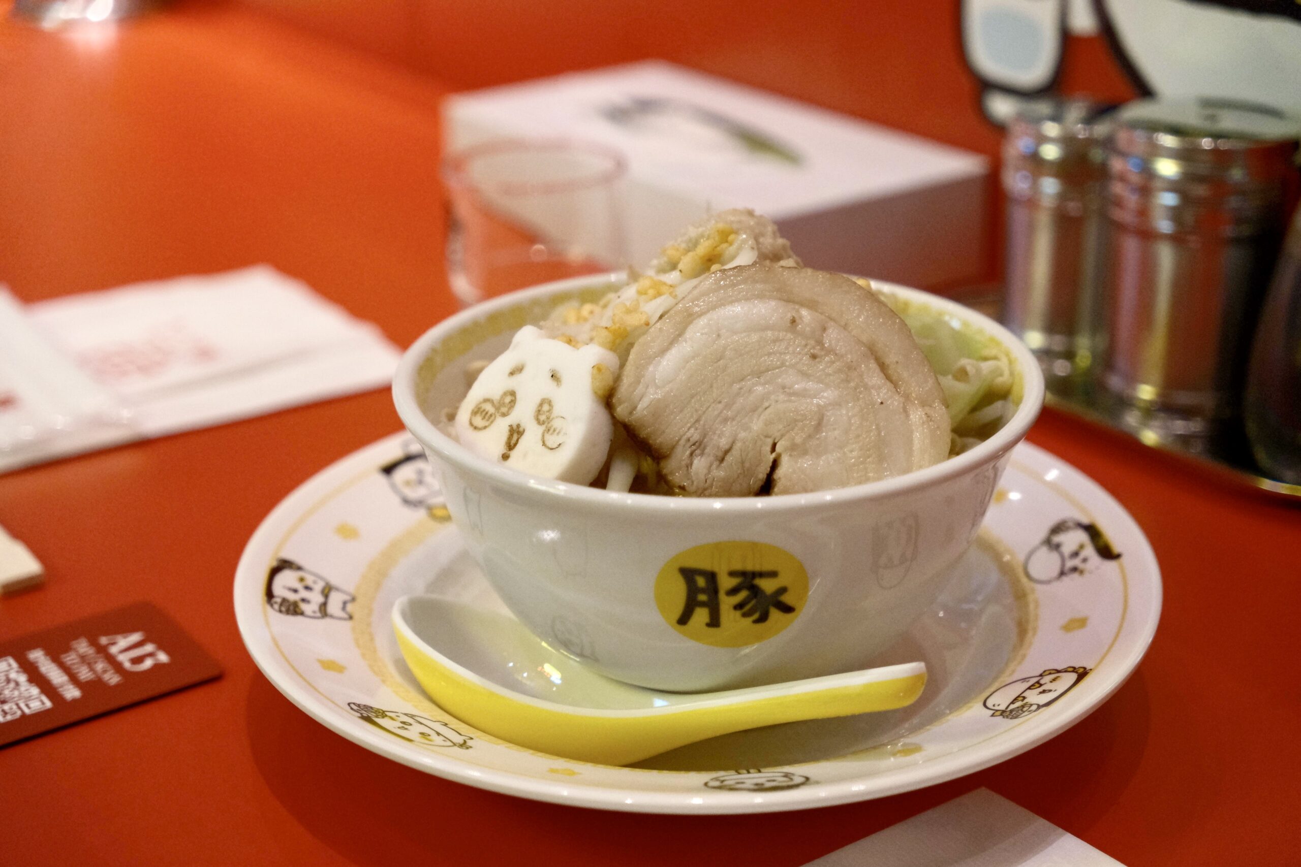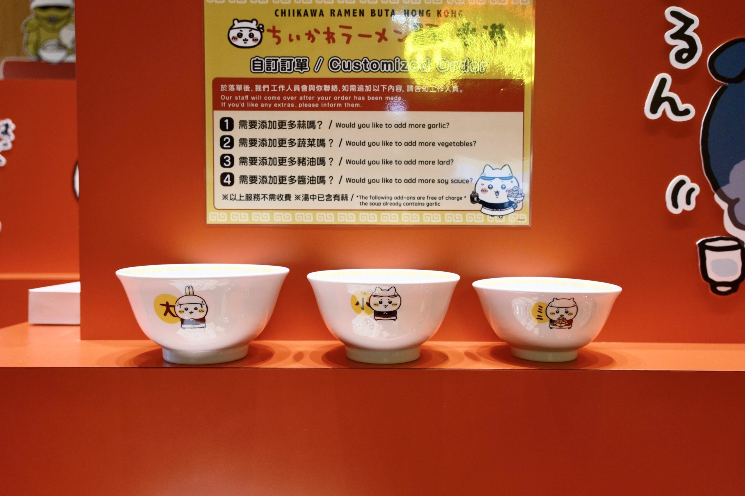 店內主打日本本店原味的招牌拉麵,湯頭和食材均從日本直送,保證地道風味。拉麵份量巧妙對應三位主角(由左至右):兔兔(大份) HK$150、小八(中份) HK$135、吉伊卡哇(小份) HK$115。每碗拉麵更有附贈可愛角色魚板和對應貼紙,顧客還可自訂蒜、蔬菜、豬油或醬油的份量,無需額外費用。