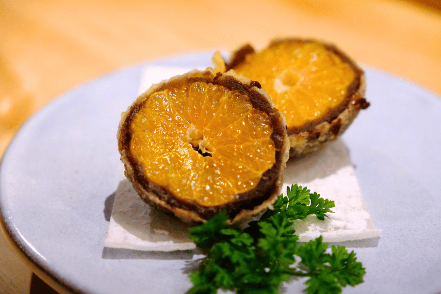 甜品亦相當有驚喜,推薦「蜜柑紅豆蓉天婦羅配麻糬」!